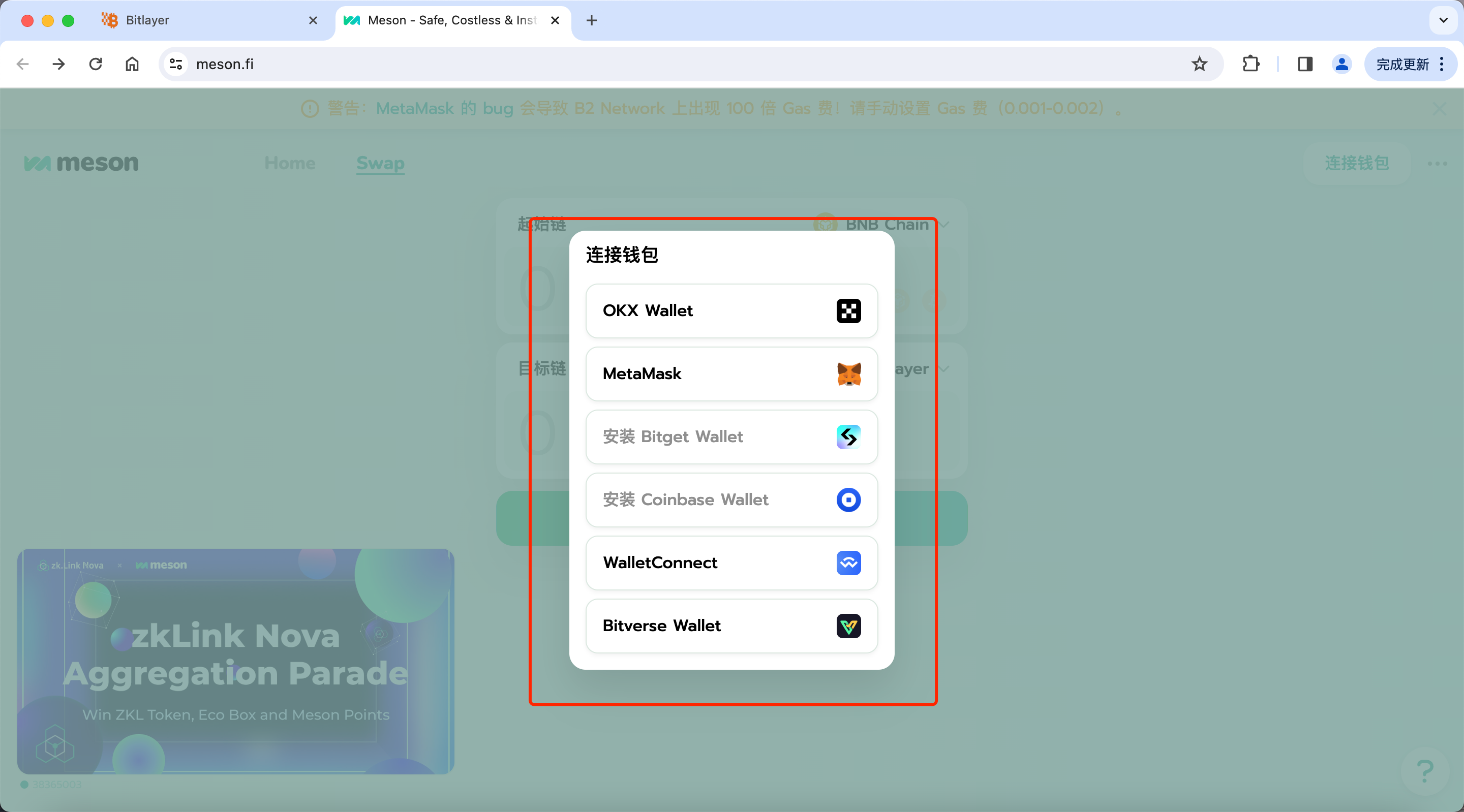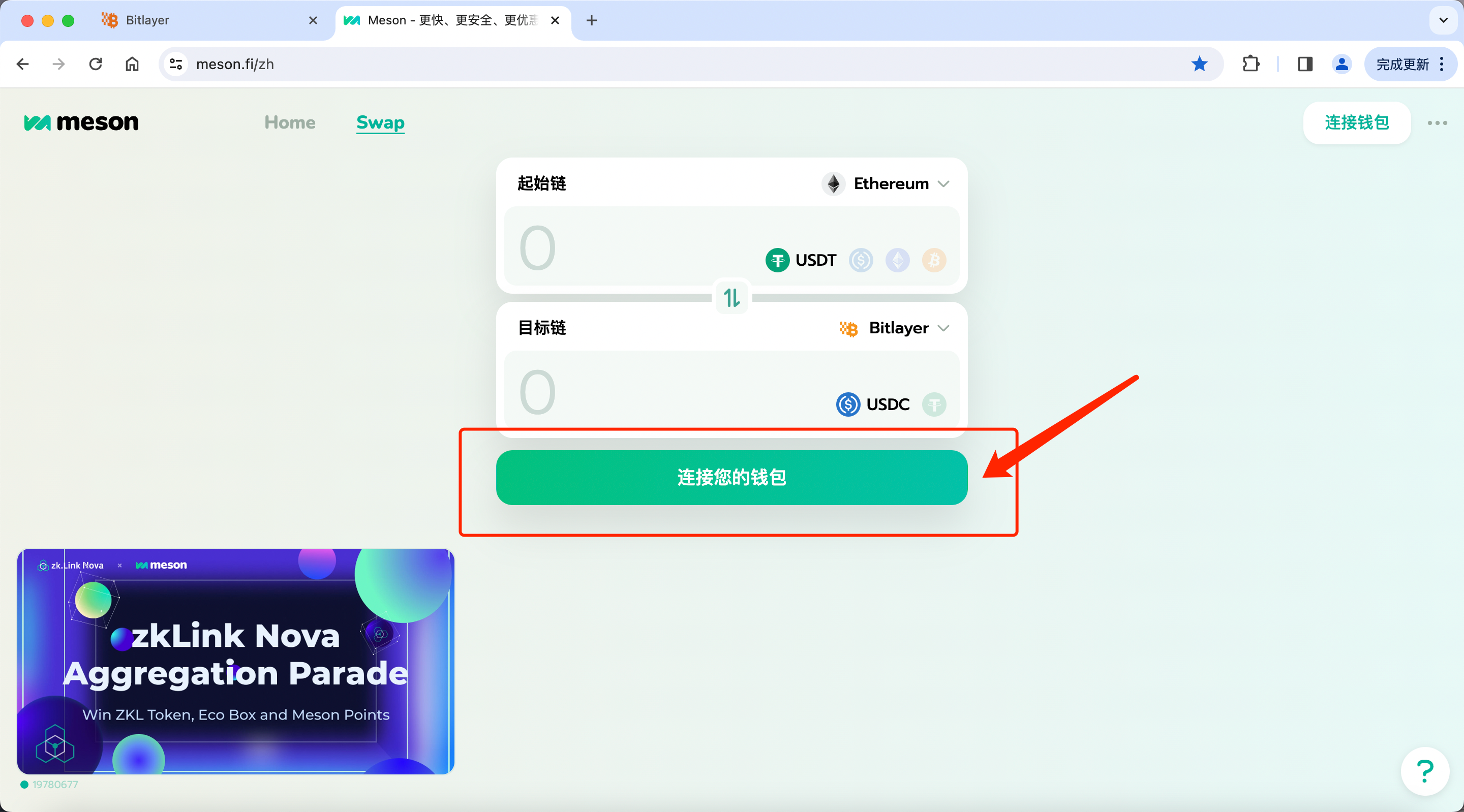3、跳转到 Meson 桥,点击【连接您的钱包】