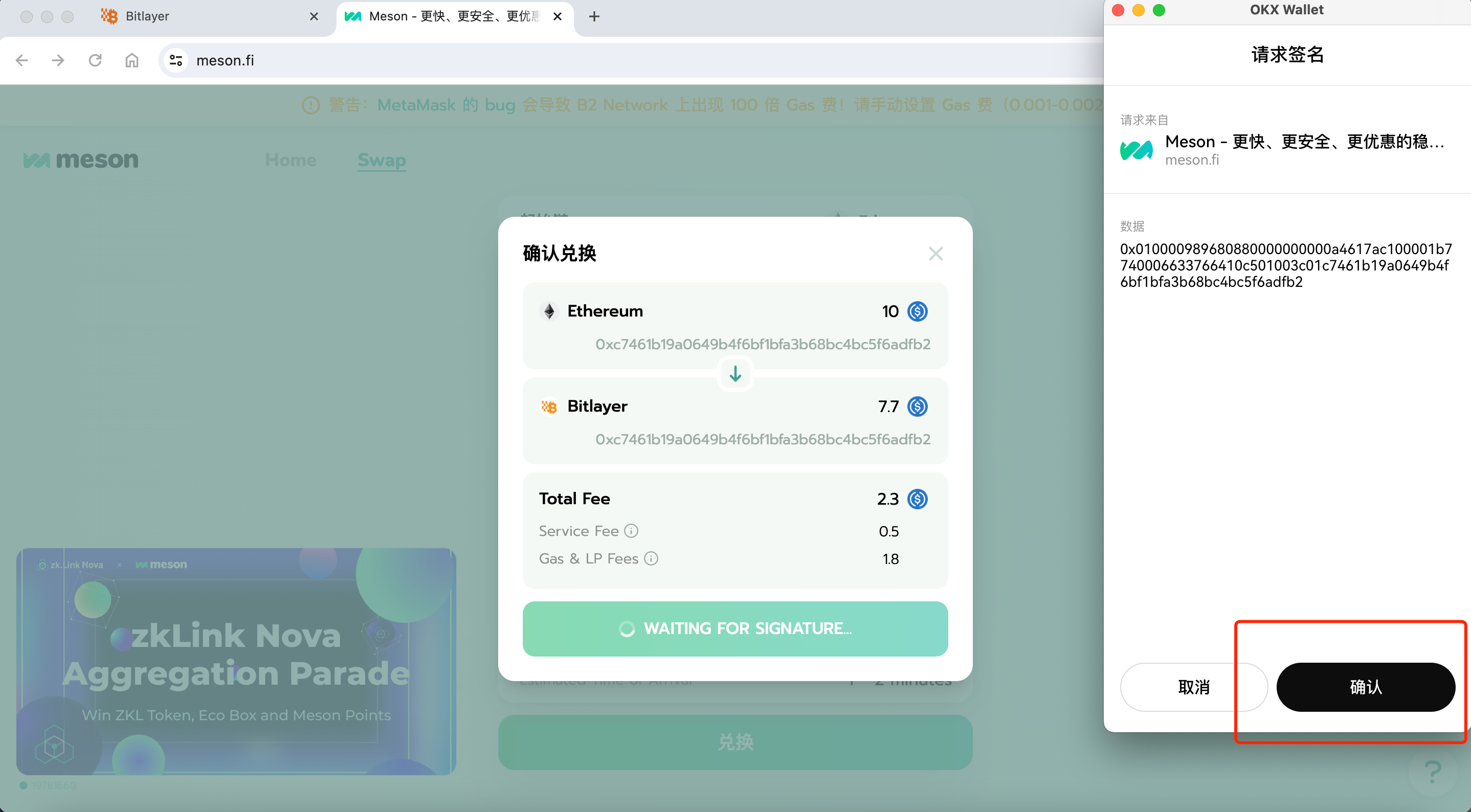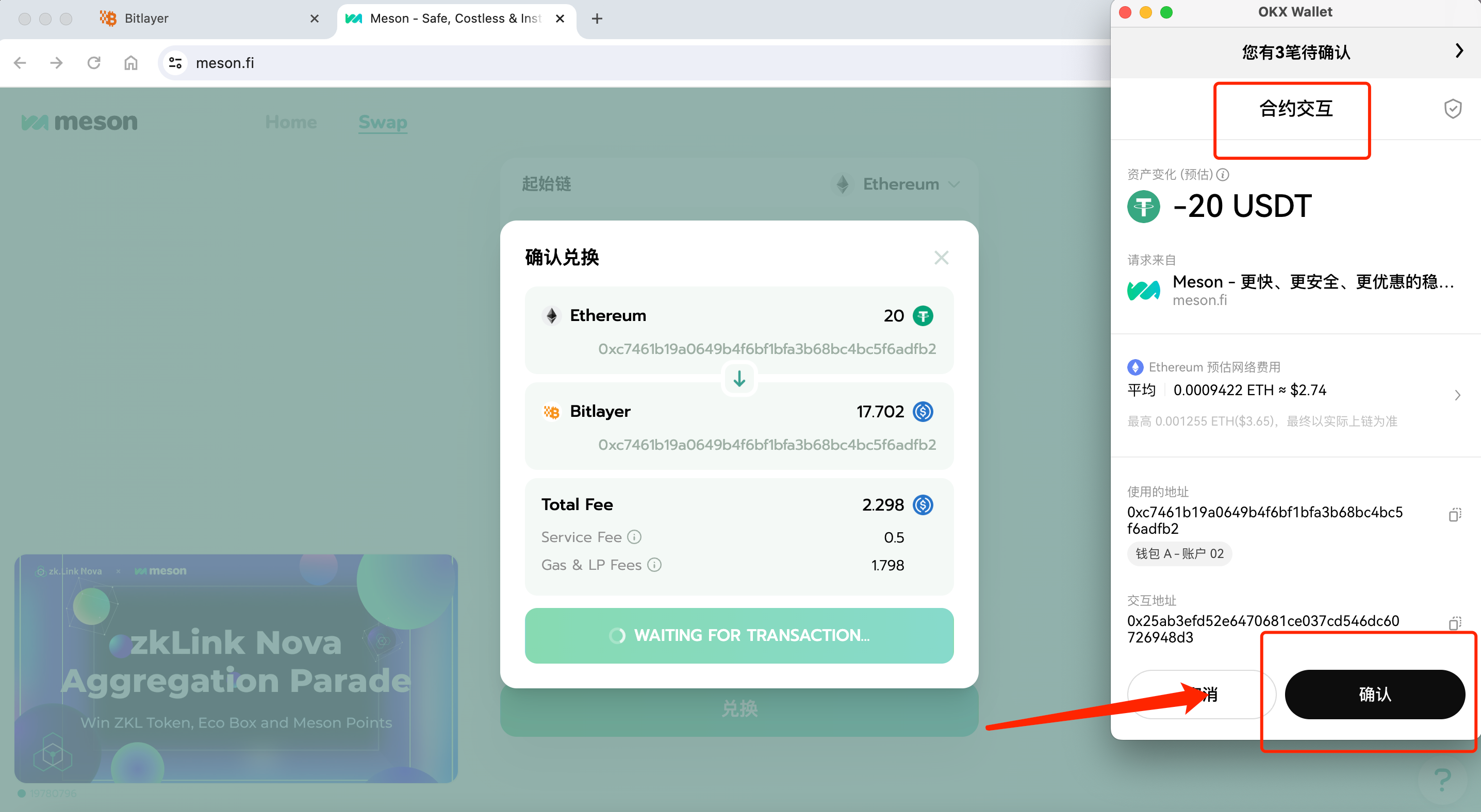 7、分别在 Meson 的确认兑换页面点击【确认】,在 OKX 签名页面点击【确认】,OKX 合约交互页面点击【确认】