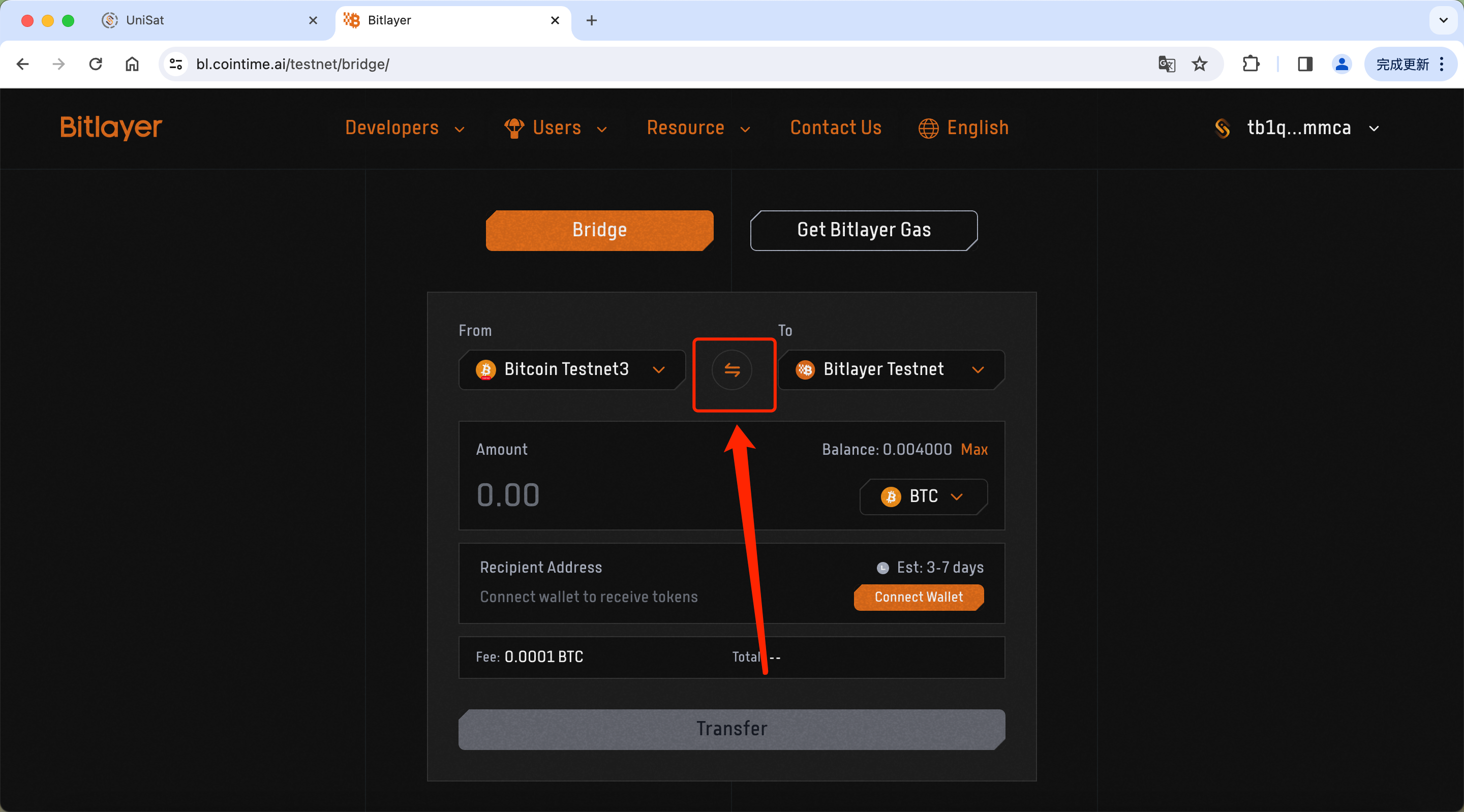 2. Note that by default, the website will show “Bitcoin” crossing to “Bitlayer,” so you’ll need to click on the arrows between those two options to toggle which direction you want your transaction to go.