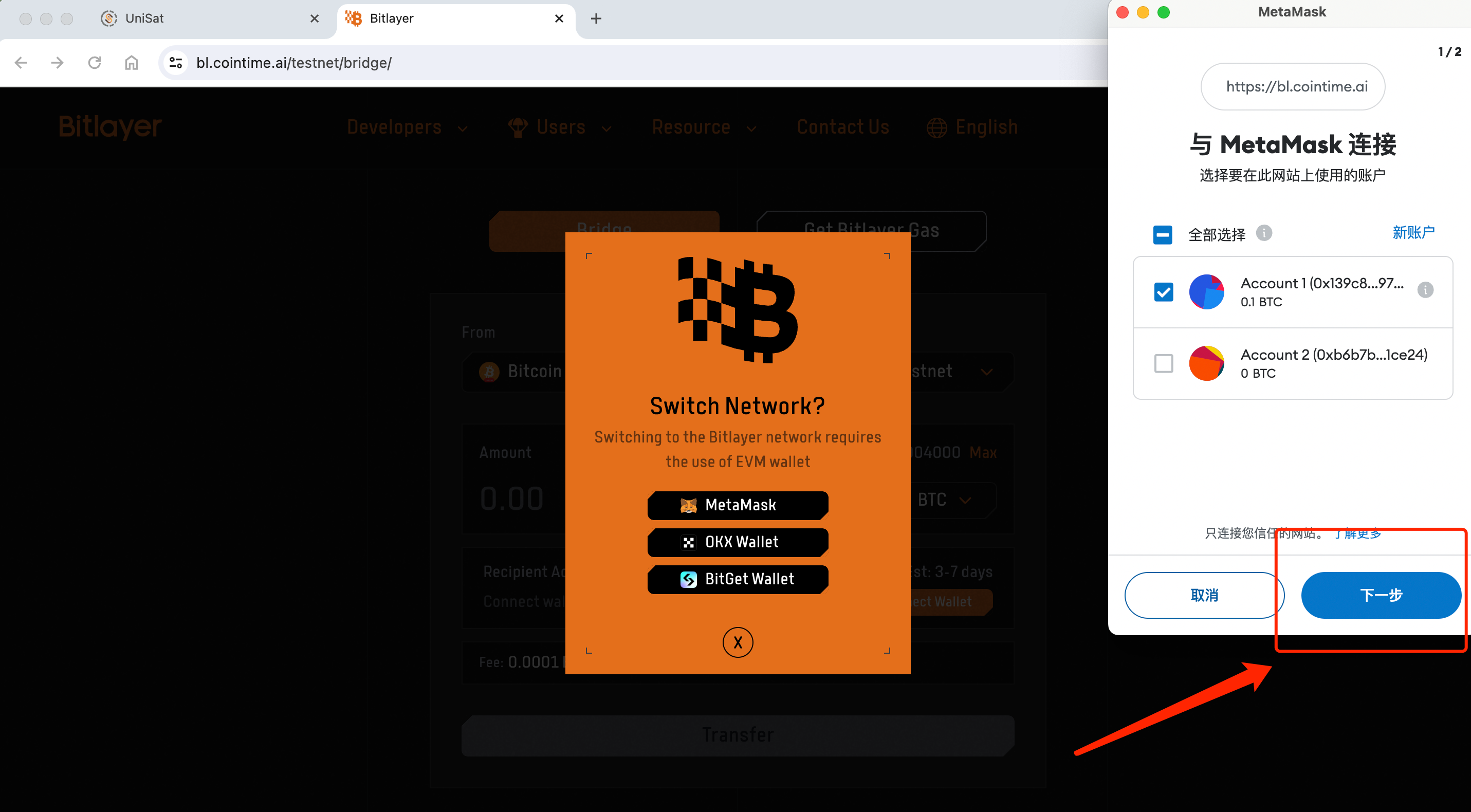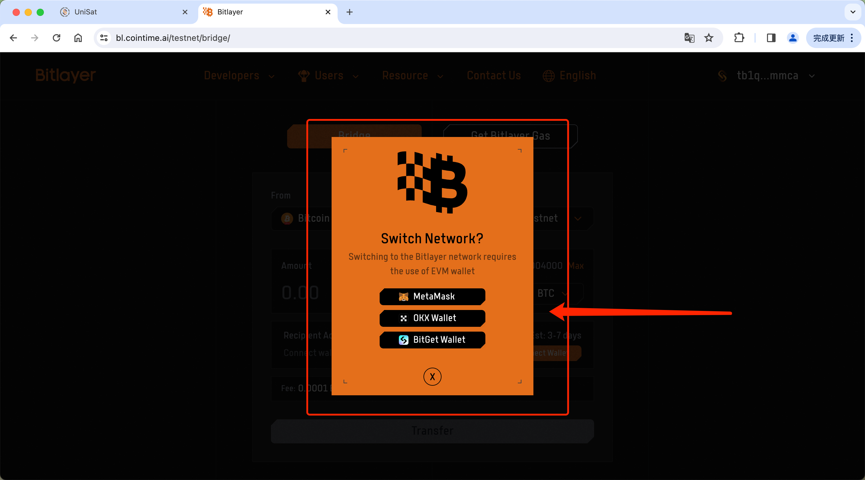 3. After setting the origin network to Bitlayer, you’ll be prompted to select an EVM wallet. It’s important to use the wallet you previously used when crossing to BTC.