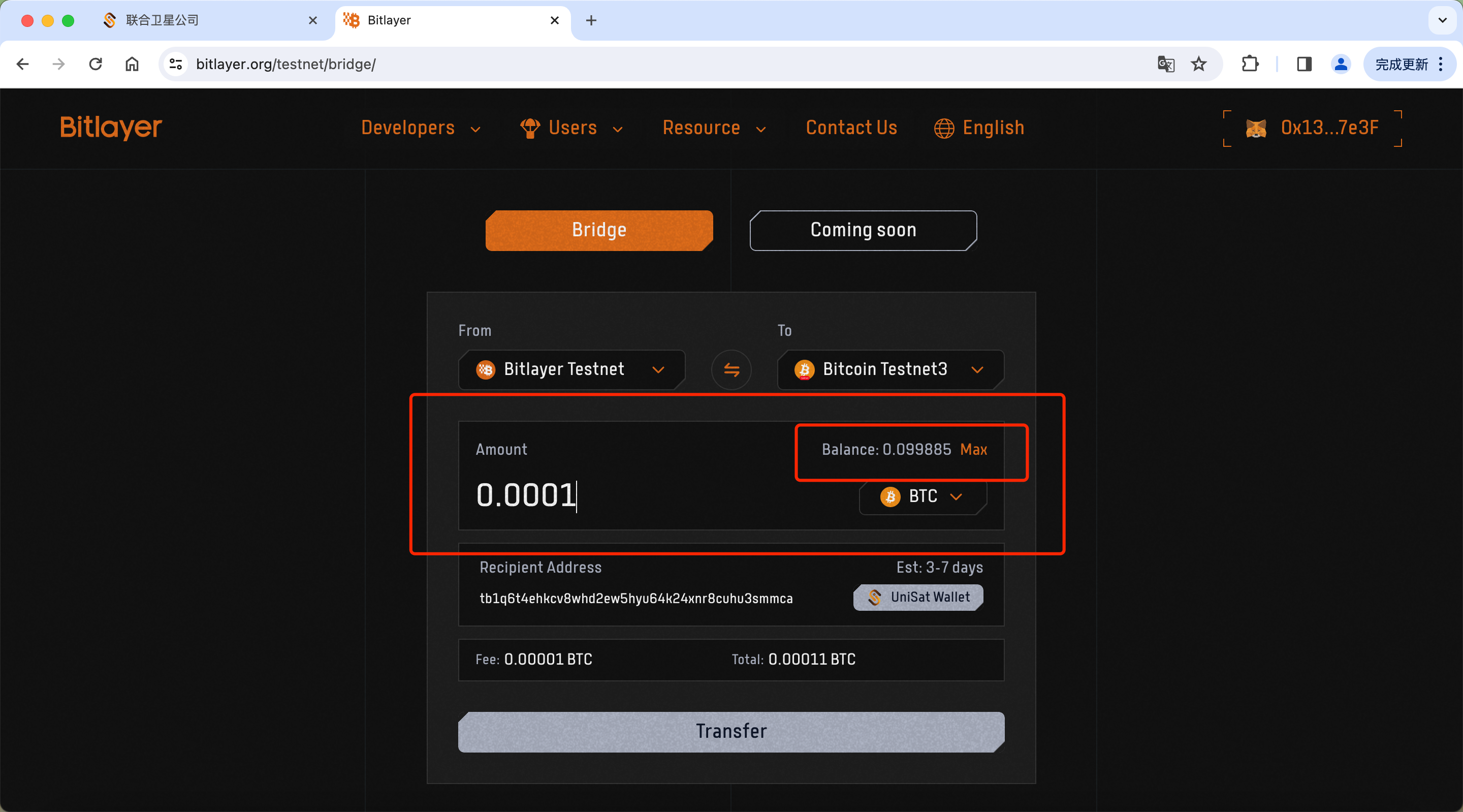 (3) A sufficient amount has been reserved for the cross-chain fee (the cross-chain fee is currently set at 0.00045 BTC). This means the amount of BTC you enter should be less than your total balance.