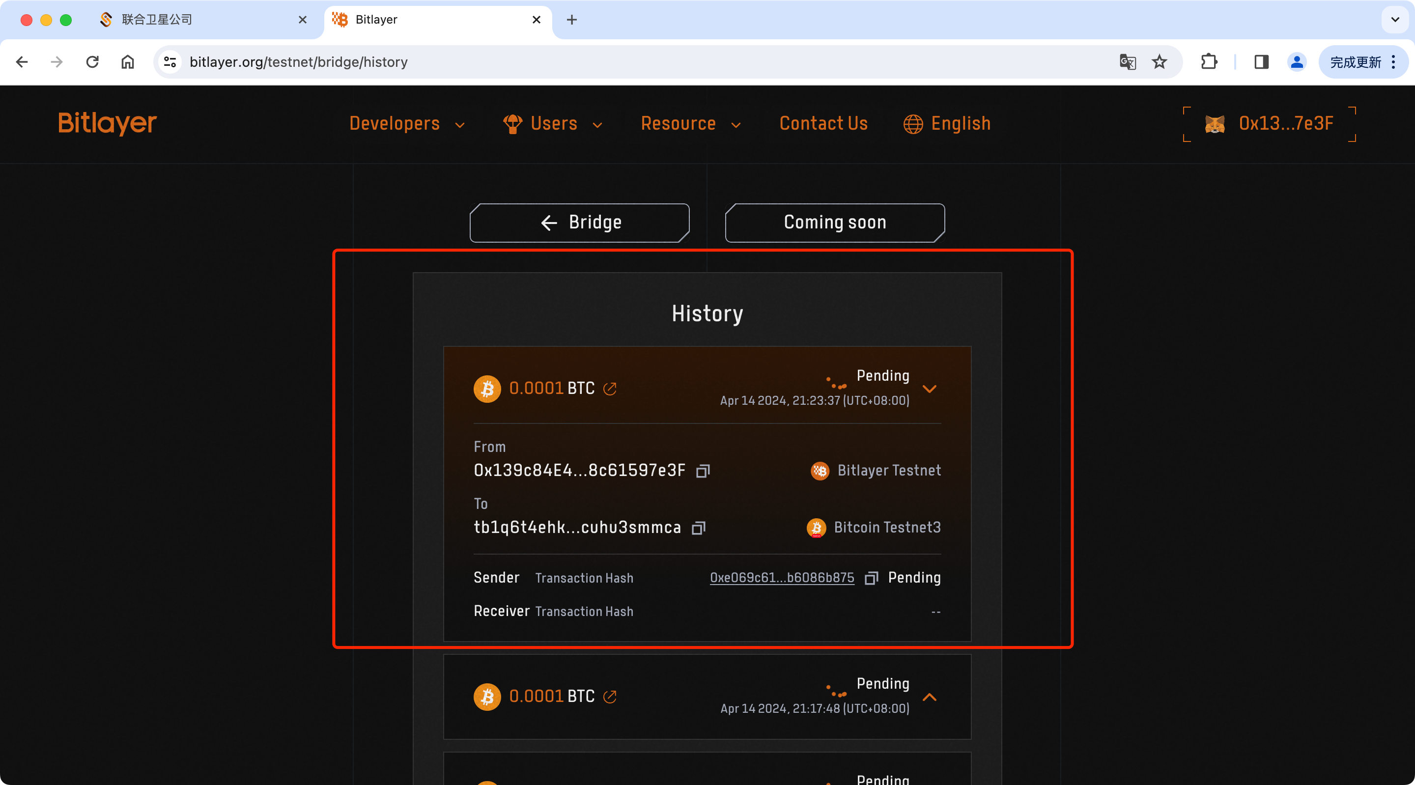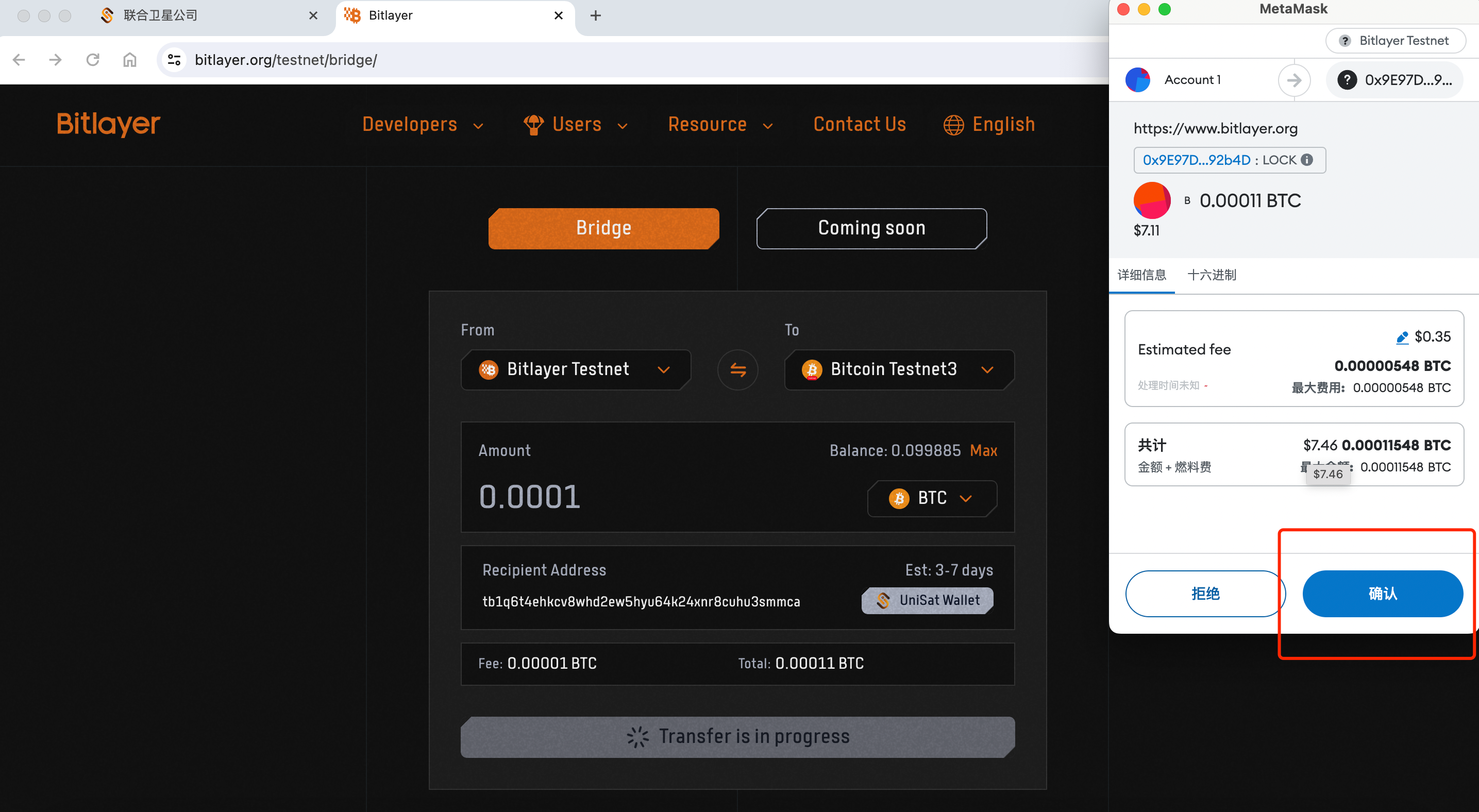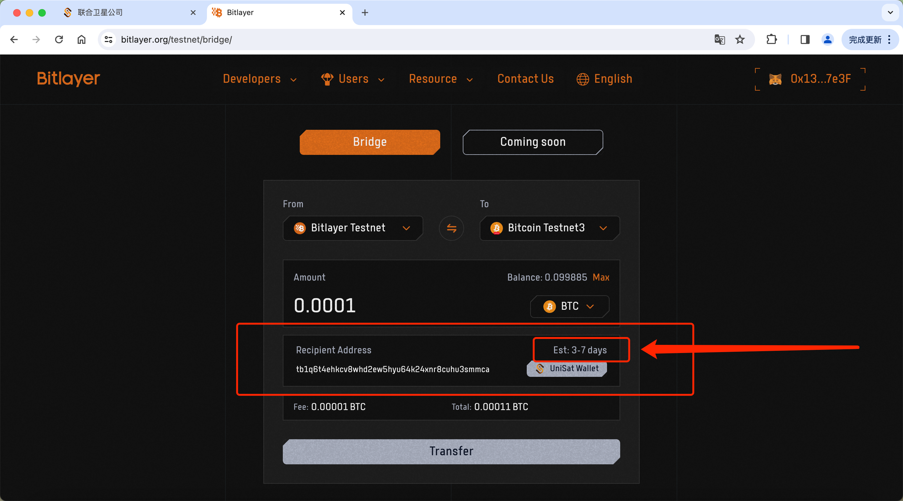 8. If you see the page as shown below, it means you have successfully transferred BTC. In 3–7 days, your Unisat Wallet will receive the bridged BTC.